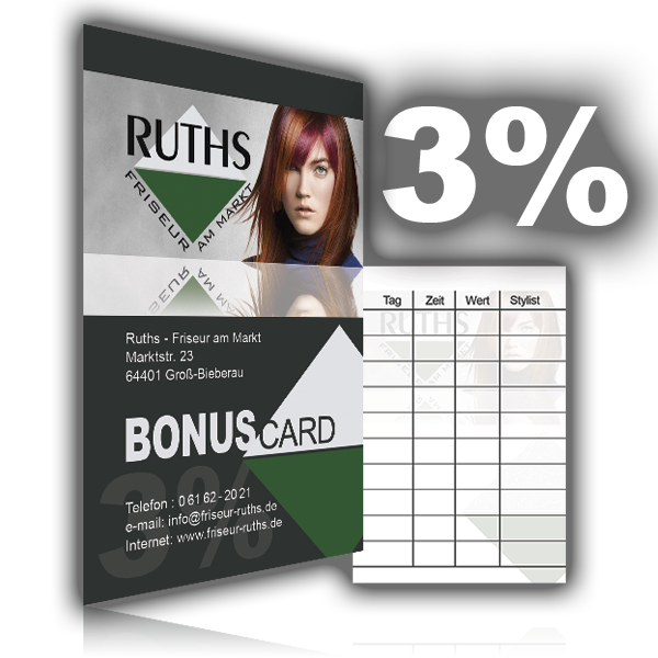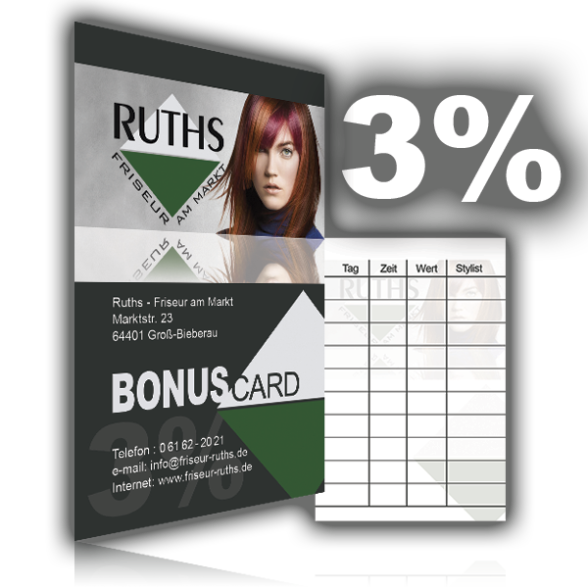 Bei Ihrem zehnten Besuch in unserem Salon erhalten Sie 3% Treuebonus auf den Gesamt-Rechnungsbetrag Ihrer letzten zehn Haarstylings.